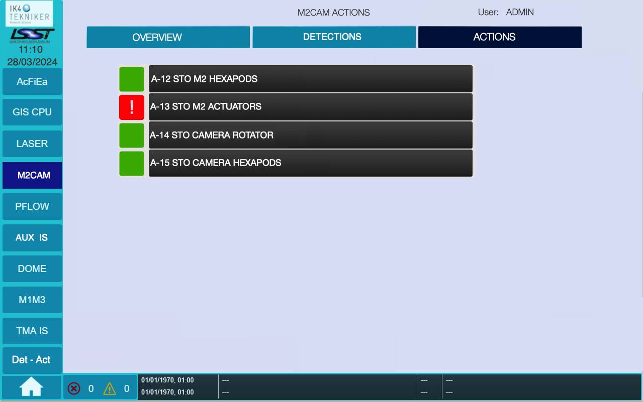 The M2CAM - Detections tab shows the signals: ‘D-14 Camera rotator pin inserted’ and ‘D-20 M2 mirror in closed-loop’.