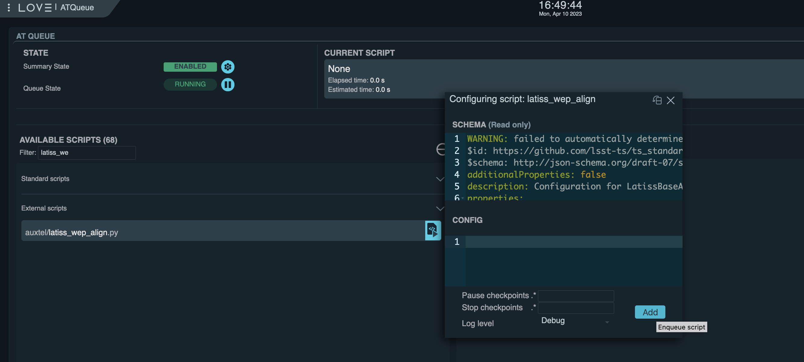 Configuring Script: latiss_wep_alignwindow, leave theCONFIGcell empty to perform the WEP over the same target the centering step was done and which the telescope is still tracking.Click on Add and the script will be added to the end of the script queue.
