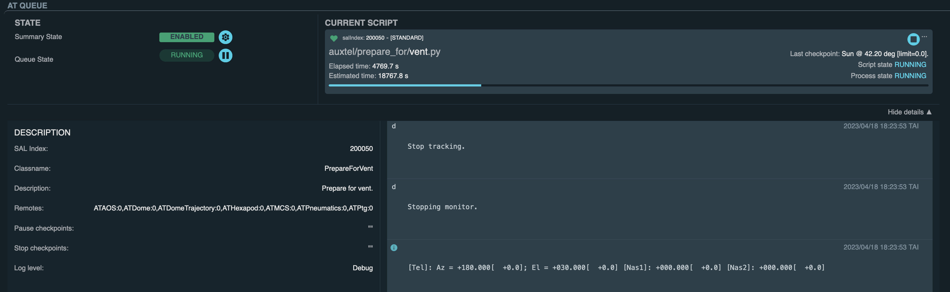 auxtel/prepare_for/vent.pyscript will run until the Sun’s elevation is 5 degrees above the horizon, if there’s no operator interaction prior to that.Once the Sun’s elevation is past below 25 degrees above horizon, please prepare for on-sky operations.
