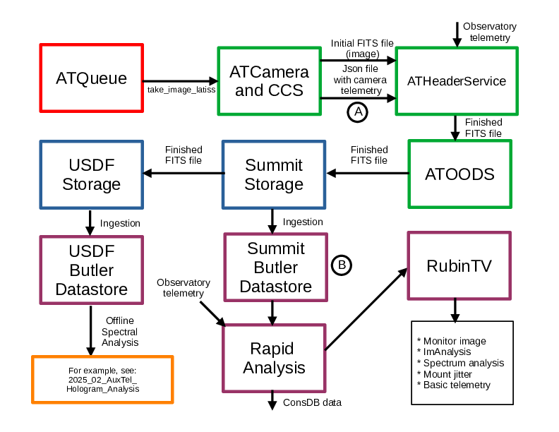 This figure shows the path of images taken by the Auxiliary telescope. After being commanded by the script queue, the CCS code under the control of ATCamera takes the requested image. The CCS code writes a FITS file (which contains the image data) and a json file which contains the camera related data for the FITS header. These two files are then passed to ATHeaderService, which places the data from the json file, as well as observatory data, into the FITS header of the final FITS file. The ATOODS CSC then places this FITS file in a storage location at the summit. These FITS files are only stored at the summit for about 1 month, after which they are deleted. A separate piece of code also copies this FITS file to a permanent storage location at USDF (the US Data Facility, in California). At both locations, these FITS files are “ingested”, which means they are read into a piece of code called the Butler, which makes it possible to quickly access the data you want from the huge amount of data that will eventually be stored.