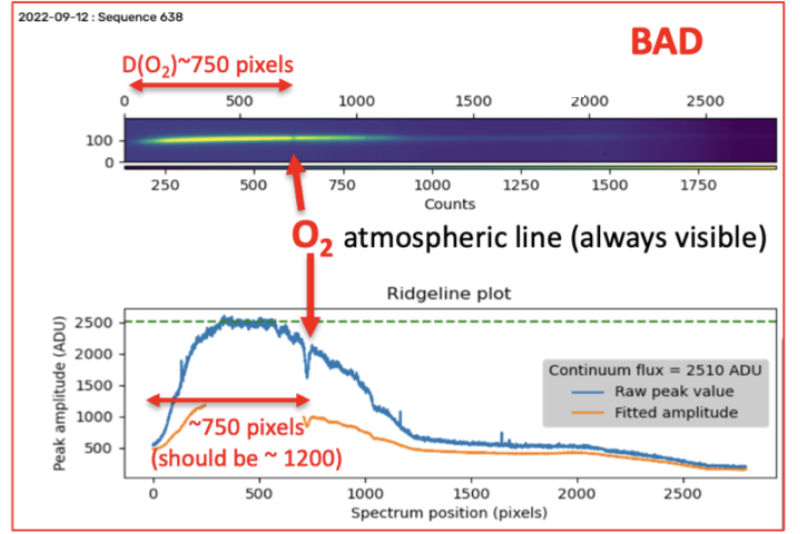 The oxygen absorption line is always visible, but may be difficult to locate for certain spectra. Make sure to verify noticeable absorption profile characteristics (line width, depth, etc.) is present in the 1D spectrum (Fig 2 bottom panels). If it is too difficult to identify the line in both spectra then try another sequence.
