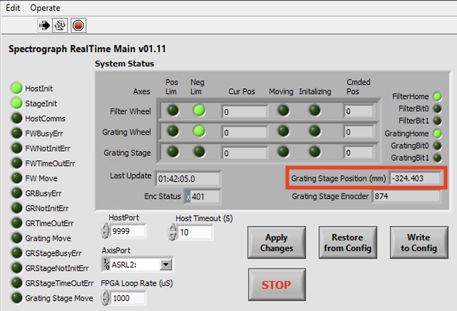 If you were unable to clear the fault with the Re-init axes button, a restart of the cRIO will be required. Before restarting, check the grating stage position in the EUI. To ensure it initializes properly after the reboot, we will need to move the linear stage to its home position before rebooting the cRIO using telnet commands. If the cRIO is rebooted without first homing the stage, it can lose its position and show an incorrect position, often -324mm which is well beyond its operational range.