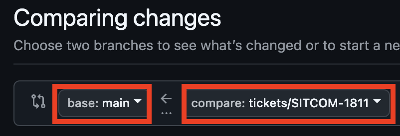 Use the base branch dropdown menu to select the main branch you’d like to merge your changes into, then use the compare branch drop-down menu to select the ticket branch where you made your changes. |