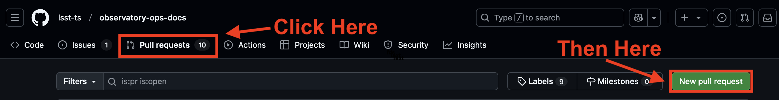 Once your document is ready for review, a pull request must be created and sent to reviewers. This allows peer-reviewed verification of any potential updates to documentation in the https://obs-ops.lsst.io webpage. Reviewers can approve/disapprove mergers as well as provide corrections to your documents before deployment. The following steps will guide you through creating and managing a pull request on GitHub.