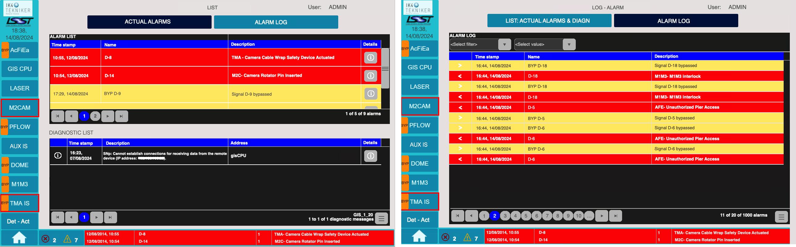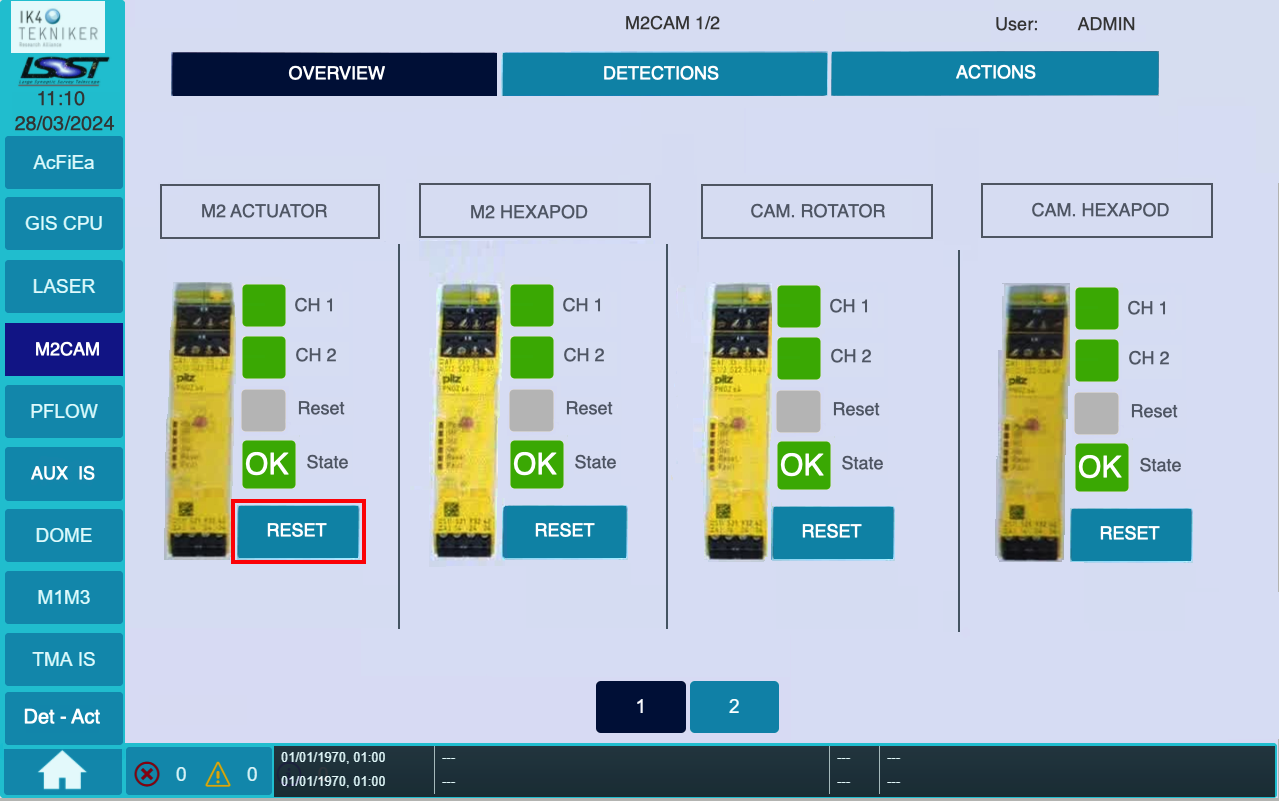 The M2CAM - Detections tab shows the signals: ‘D-14 Camera rotator pin inserted’ and ‘D-20 M2 mirror in closed-loop’.