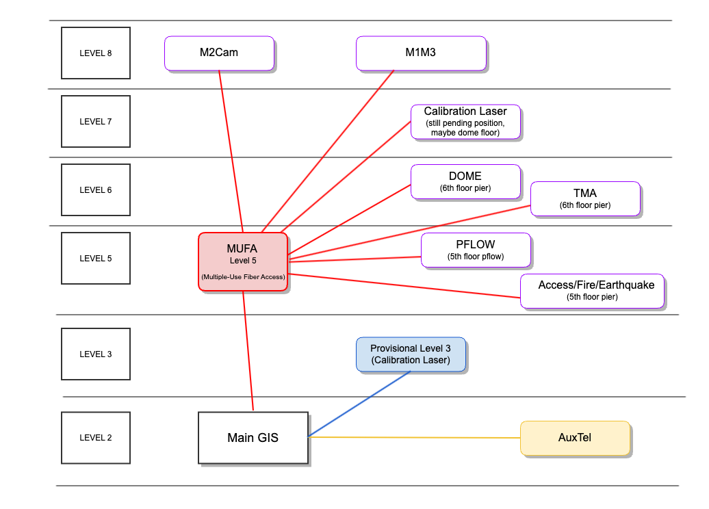 Signals wires: Earthquake, Access control, Pflow lift, Calibration Laser, and the top-end subsystems: M2Cam (that includes M2, M2 Hexapod, Camera Rotator, Camera Hexapod).