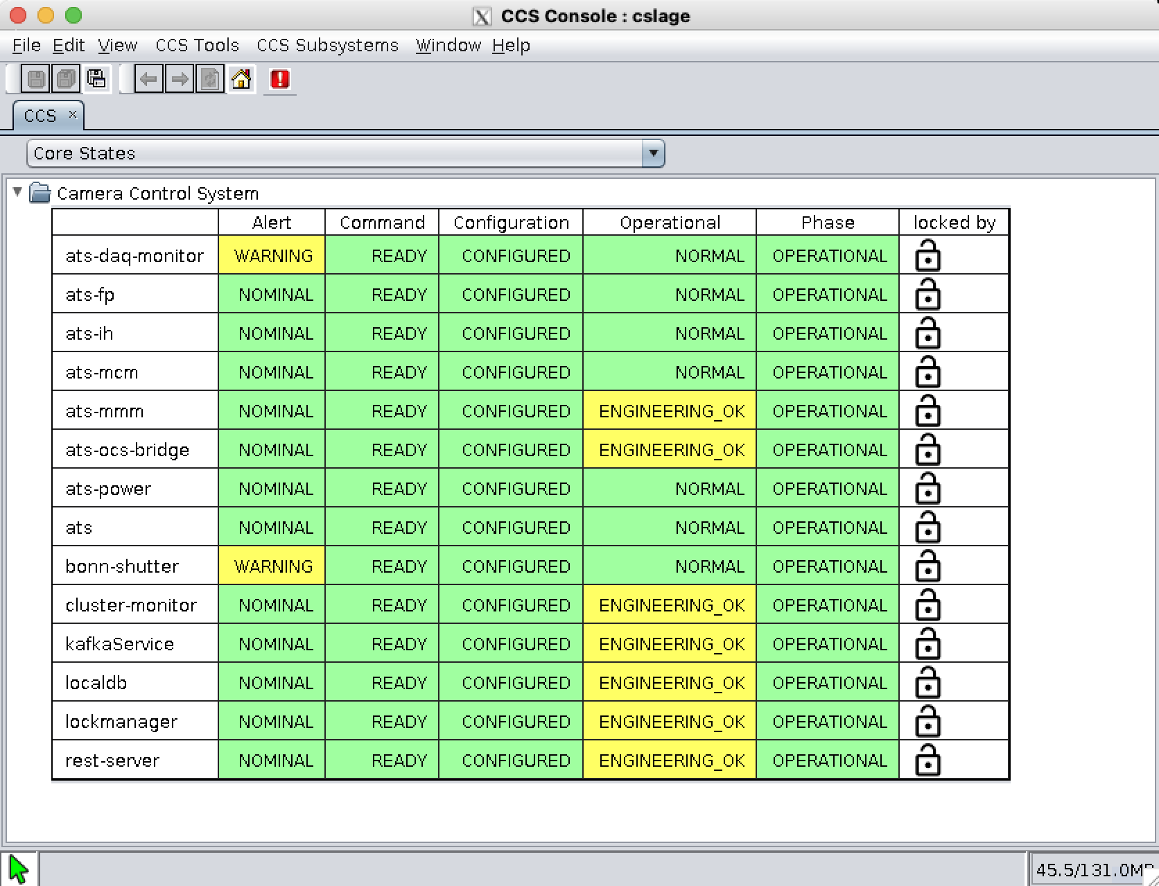 ccs-console -Dsun.java2d.xrender=false -Dsun.java2d.pmoffscreen=false&After the CCS-Console window opens, use the pulldown-menu to launch CCS Tools > Monitoring > Whole Camera > CCS Health.