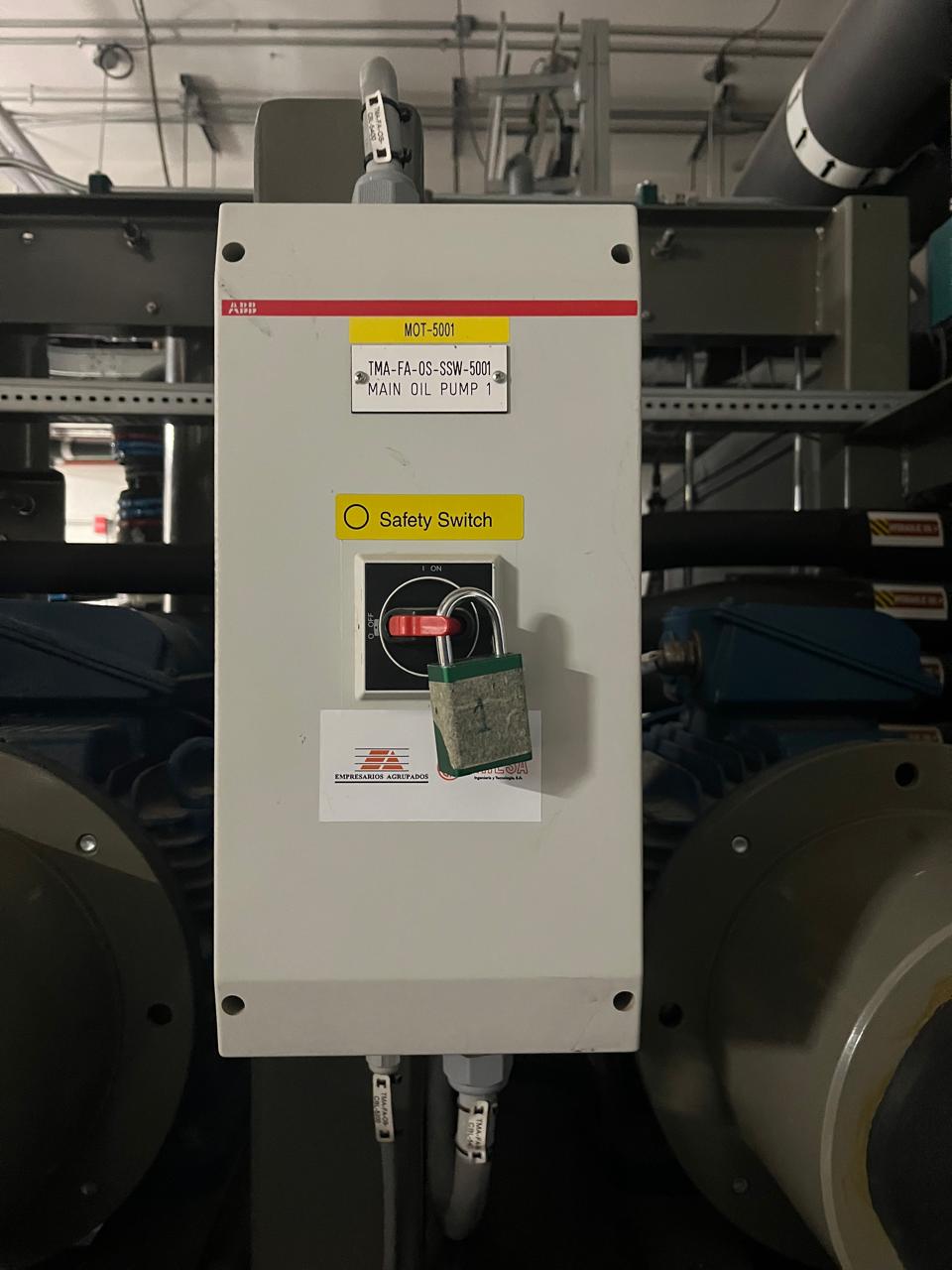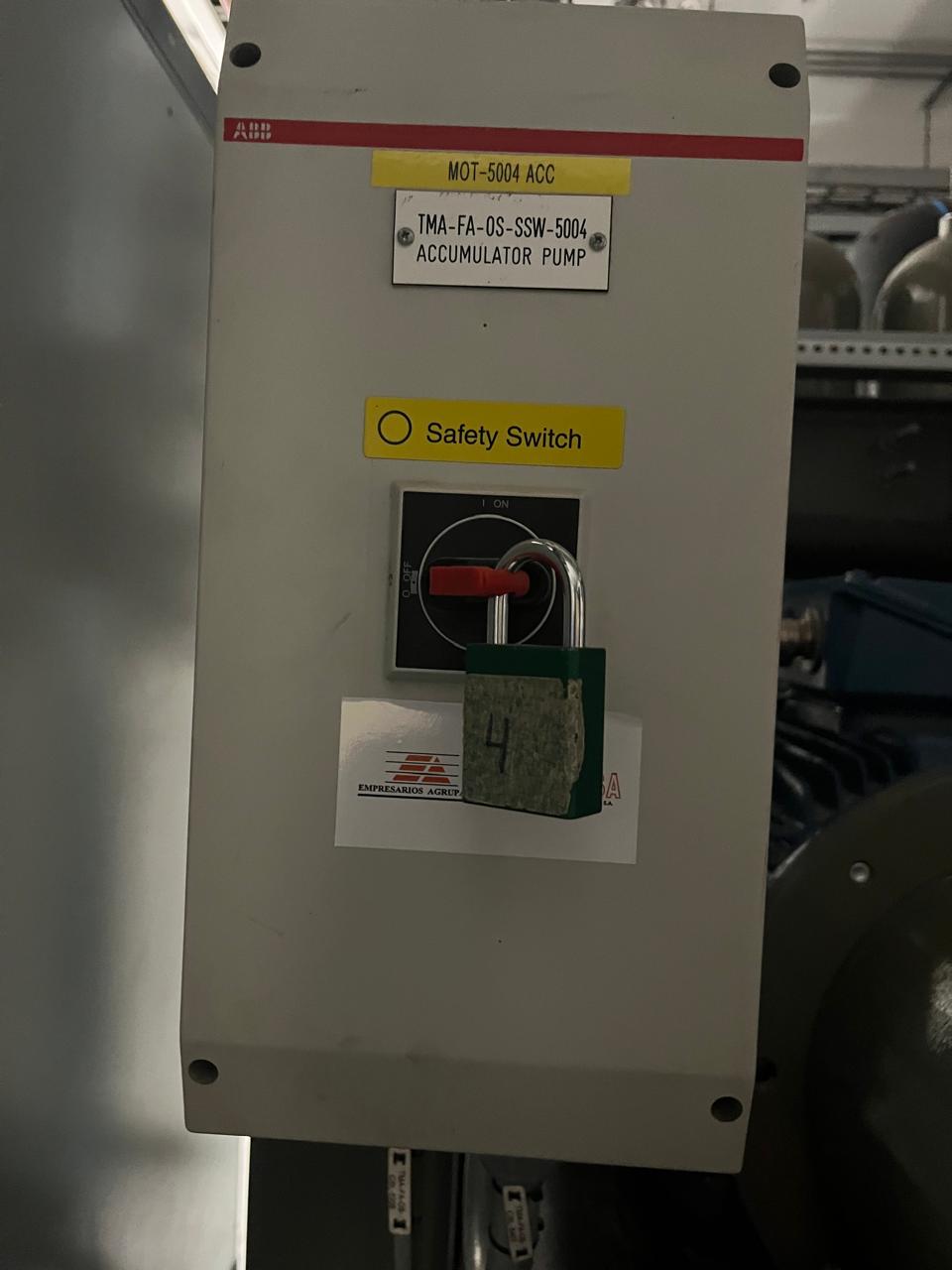 Applying LOTO on the OSS Pump: Go to the OSS room from Level 1 (first floor). Apply LOTOs on the OSS pump switches (highlighted by the box in the following Figure). Close valves (Position “—-”) and put locks on the holes to apply three LOTOs on the safety switches of the OSS pumps.