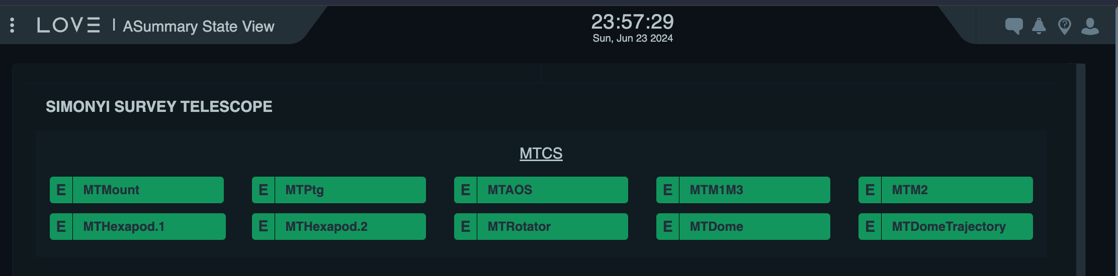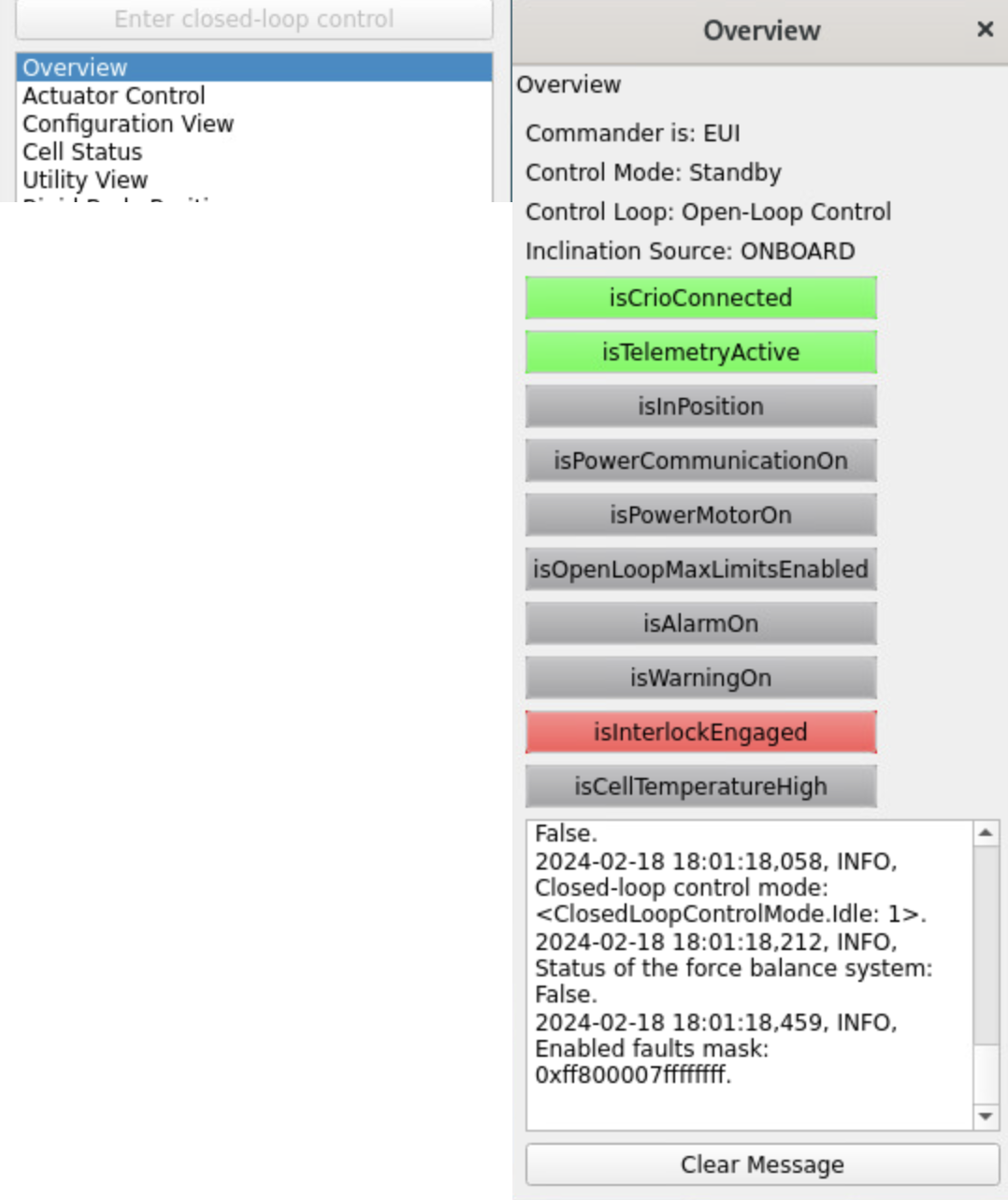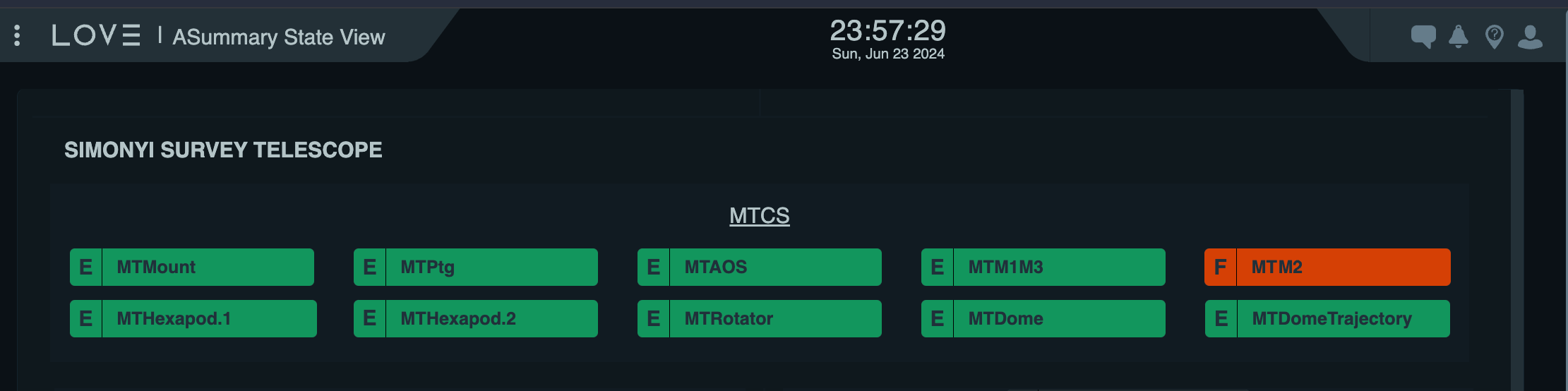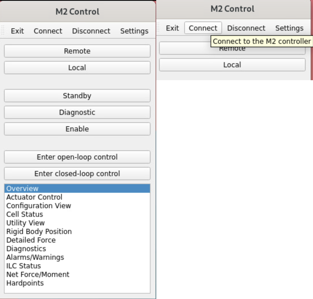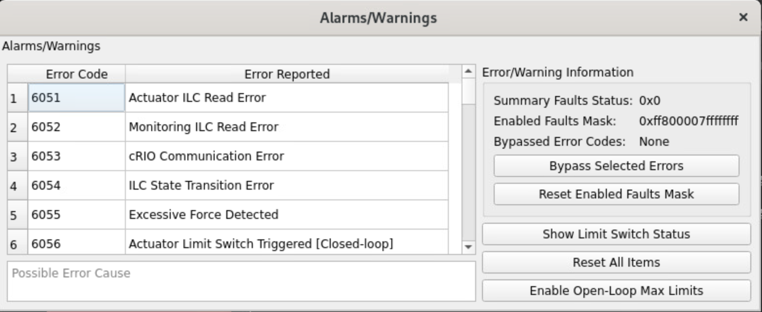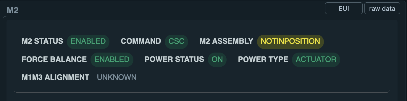 Note that all status boxes for the M2 actuator will appear green. This indicates the status of the relay that enables power to the systems, not the status of M2 itself. Therefore, after an interlock or power cycling, it is necessary to press the RESET button.