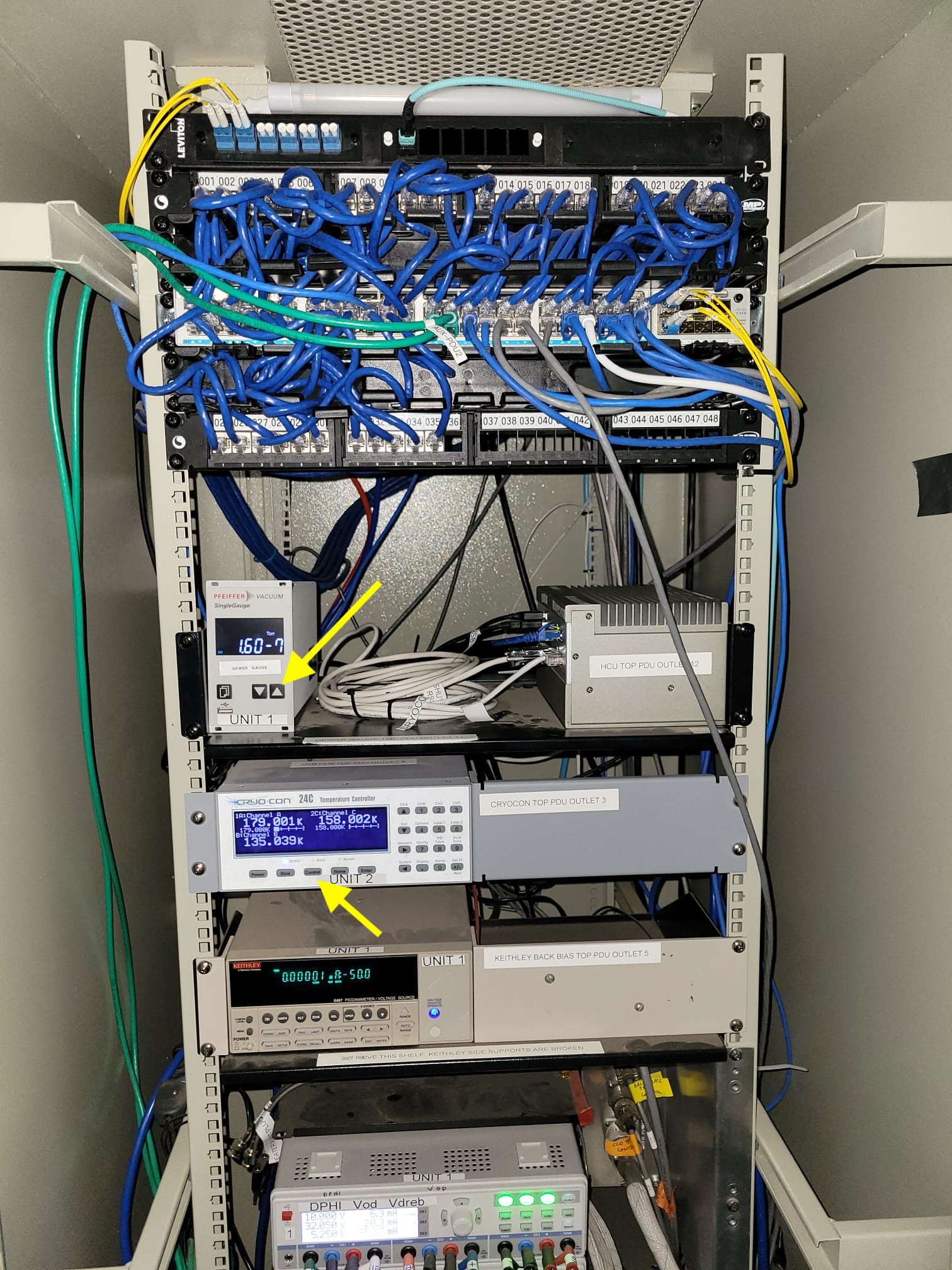 The main ATCamera electronics and sensor readout cabinet is on the first floor, next to the chiller, and is shown in Figure 1. Figure 2 shows the inside of this cabinet after opening the door. After a loss of power or other major work, the chiller should start up, but there are typically two things that need to be done, as shown by the yellow arrows in Figure 2: