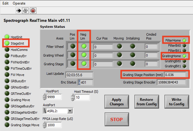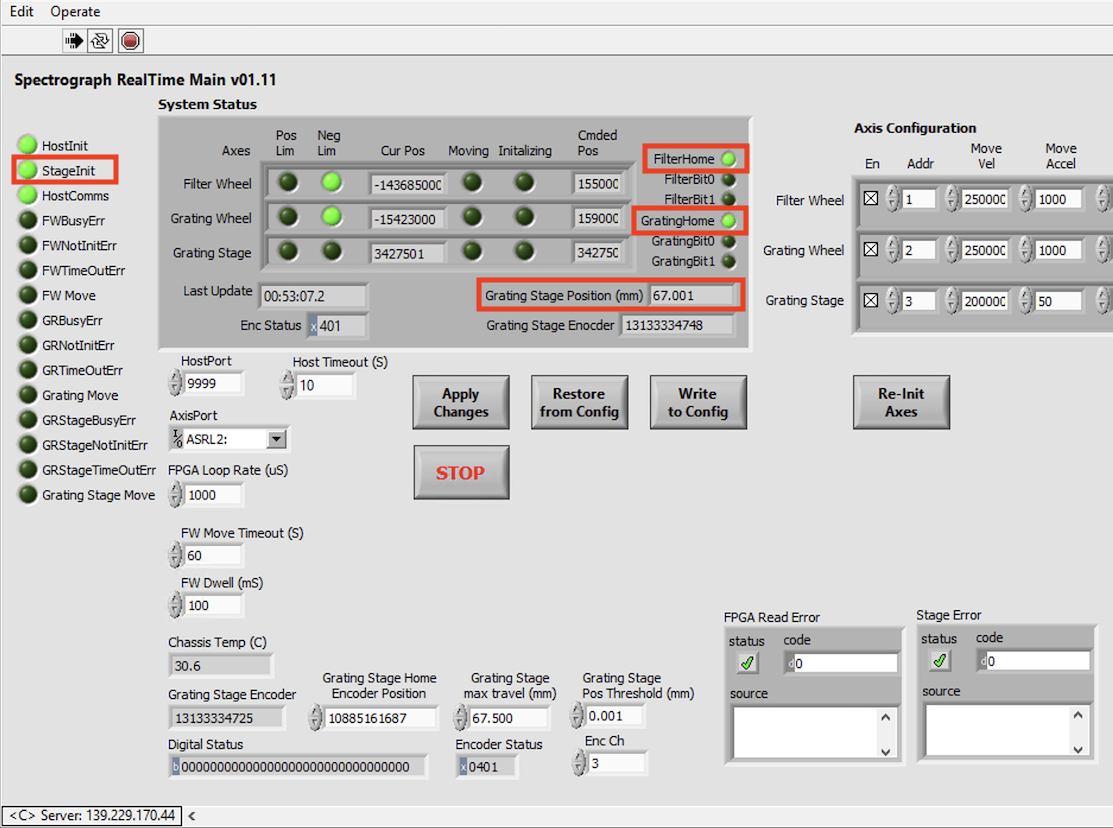 If you were unable to clear the fault with the Re-init axes button, a restart of the cRIO will be required. Before restarting, check the grating stage position in the EUI. To ensure it initializes properly after the reboot, we will need to move the linear stage to its home position before rebooting the cRIO using telnet commands. If the cRIO is rebooted without first homing the stage, it can lose its position and show an incorrect position, often -324mm which is well beyond its operational range.