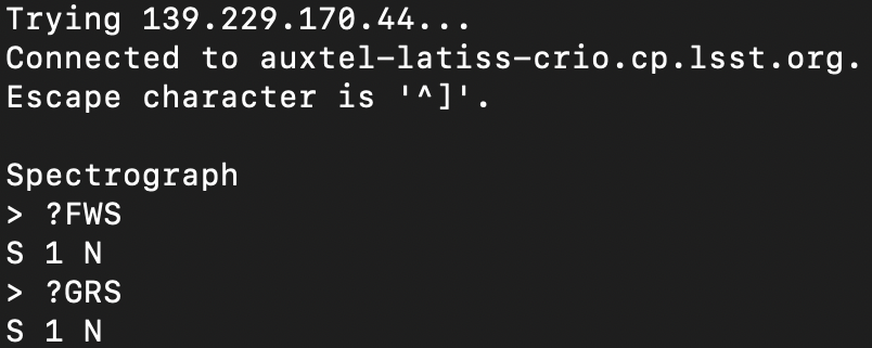 ?FWSand?GRS. These commands will display the current filter wheel and grating wheel statuses, respectively.Each command will return an array of three characters: