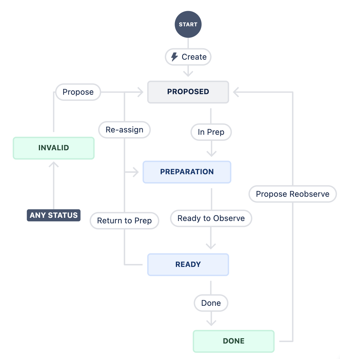 Both Invalid and Done allow transition out of these states, which is to return to the Proposed state and start the workflow over again. This transition should be rare. It is reserved for cases when a job is erroneously transitioned to a completed state, or a later analysis of the observing task deems it was not satisfactorily completed. The ticket is then transitioned to Proposed so it can be prepared and prioritized accordingly by a Commissioning Science Team.
