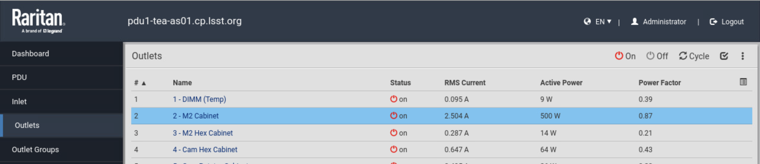 Access https://tea-pdu01.cp.lsst.org/, the internet interface of the general power distribution (PDU).
